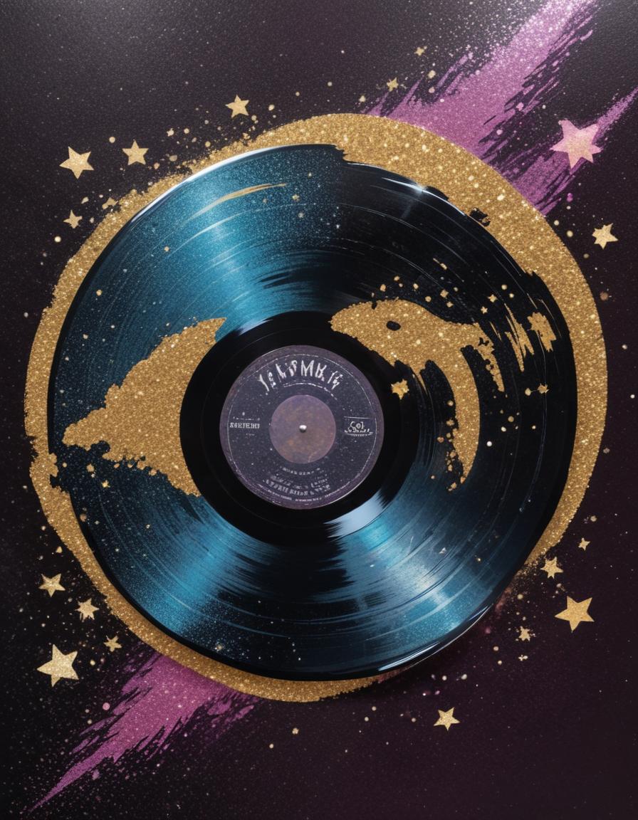 A creatively designed vinyl record featuring intricate golden accents and colorful cosmic motifs, showcasing artistic flair and musical inspiration.