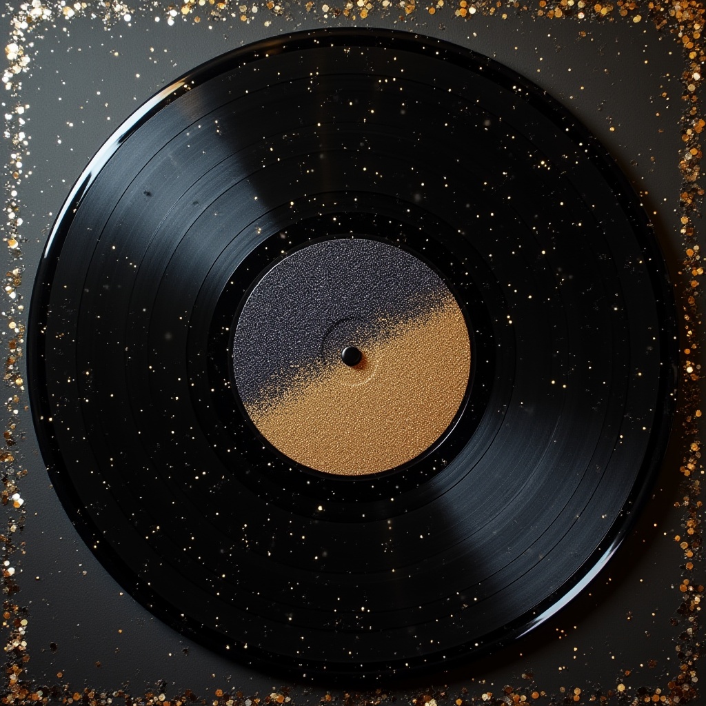 A black vinyl record rests on a dark surface adorned with sparkling gold dust, creating a captivating contrast of textures and colors.