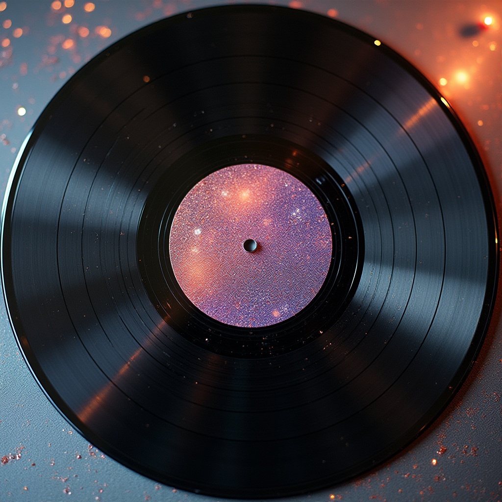 A close-up view of a black vinyl record featuring a shimmering glitter background, highlighting its grooves and design under soft lighting.