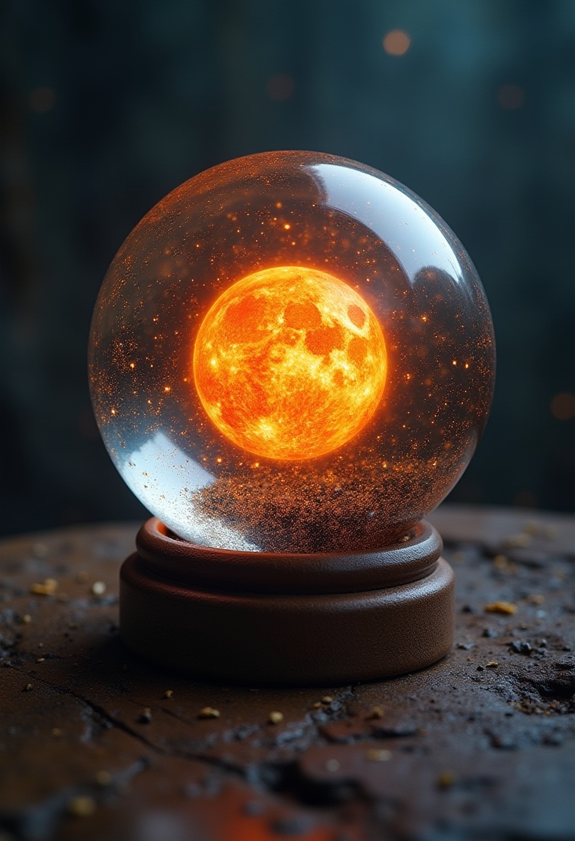 A radiant sun glows within a glass orb, creating a magical atmosphere. The orb rests on a rustic table, surrounded by scattered grains.
