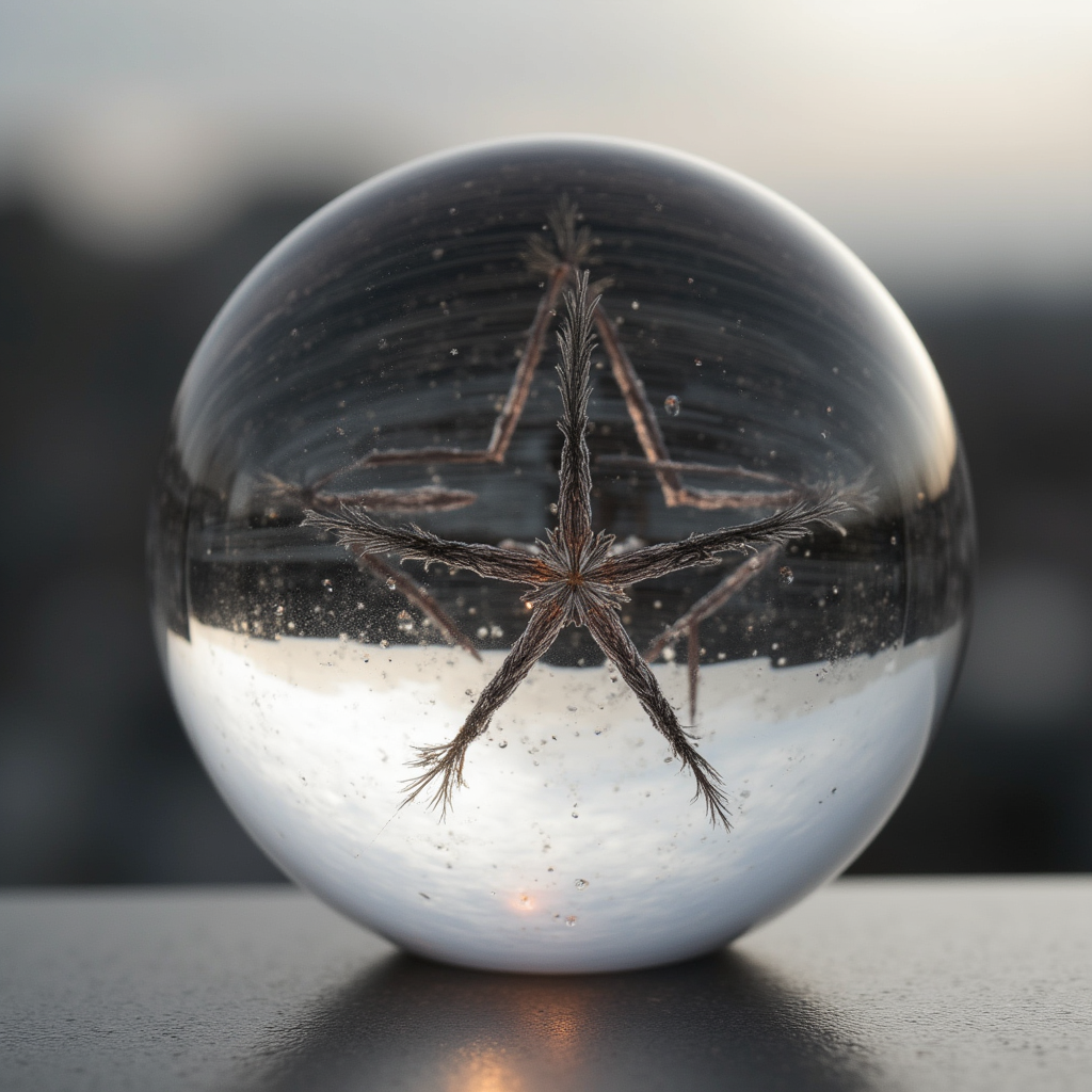 A glass orb reflects a detailed star pattern against a city skyline at dusk, capturing the serene beauty of urban life.