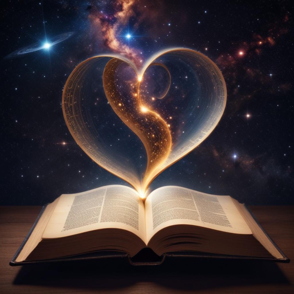 An open book releases a shimmering heart shape of stars against a cosmic backdrop, blending literature with the beauty of the universe.