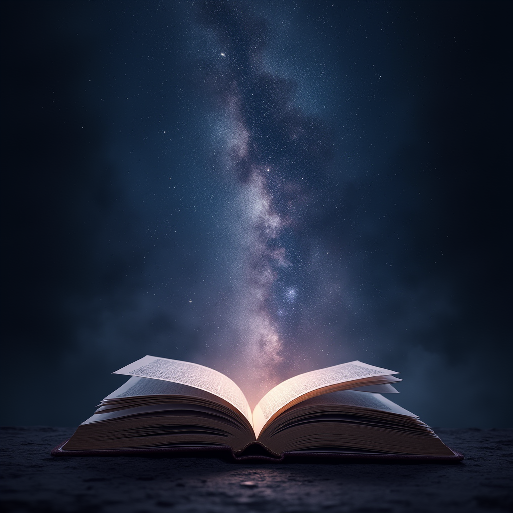 An open book sits on a dark surface, illuminating the night with a stunning view of stars and galaxies above, creating a mystical atmosphere.