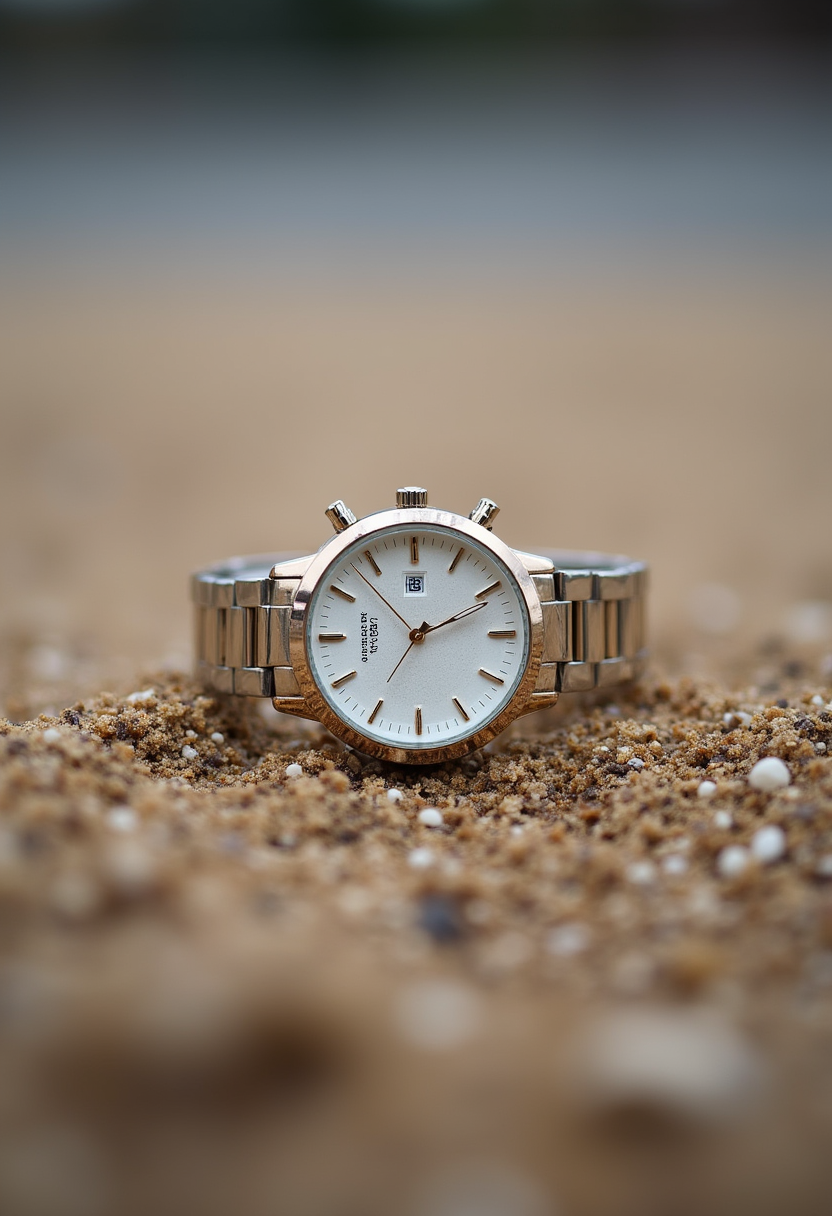 Elegant watch resting on sand at a beach setting