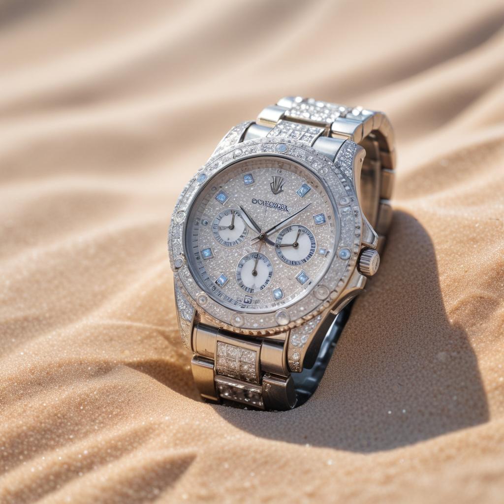 A sparkling silver watch is placed on sunlit sand, showcasing its intricate details and luxurious design against a natural backdrop.