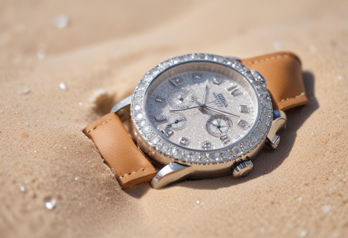 A luxurious watch lies partly buried in sandy beach terrain, showcasing its intricate design and sparkling details under sunlight.