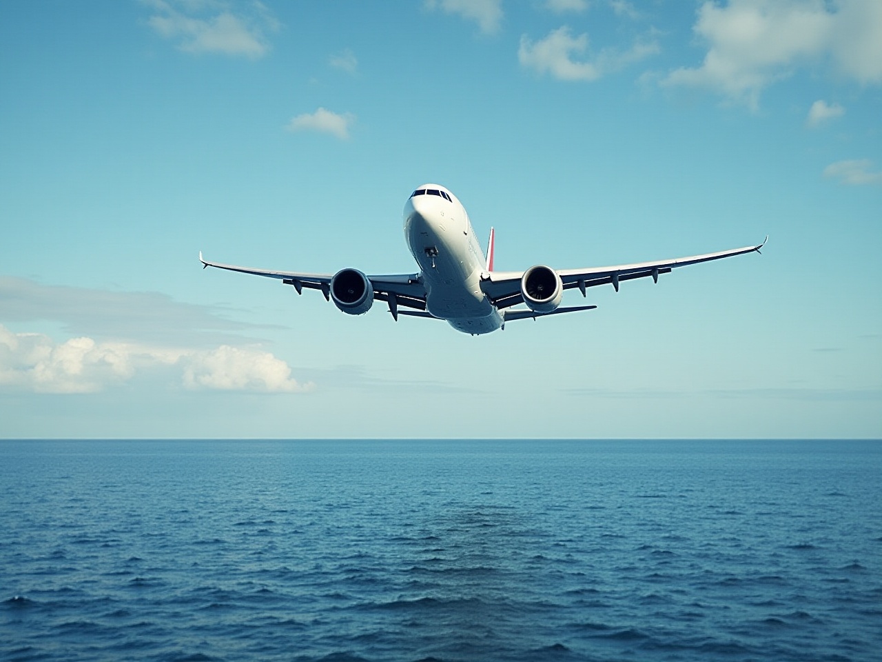 aircraft, aviation, beauty, blue, clouds, day, destination, environment, flight, freedom, horizon, journey, nature, ocean, seascape, sky, transportation, travel, water, waves