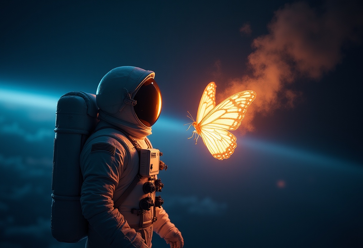 An astronaut in a spacesuit interacts with a glowing butterfly while floating above Earth, creating a surreal and enchanting moment in space.