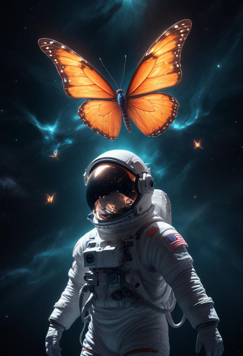 An astronaut in a space suit stands boldly in the cosmos as vibrant butterflies flutter around, creating a surreal and enchanting atmosphere.