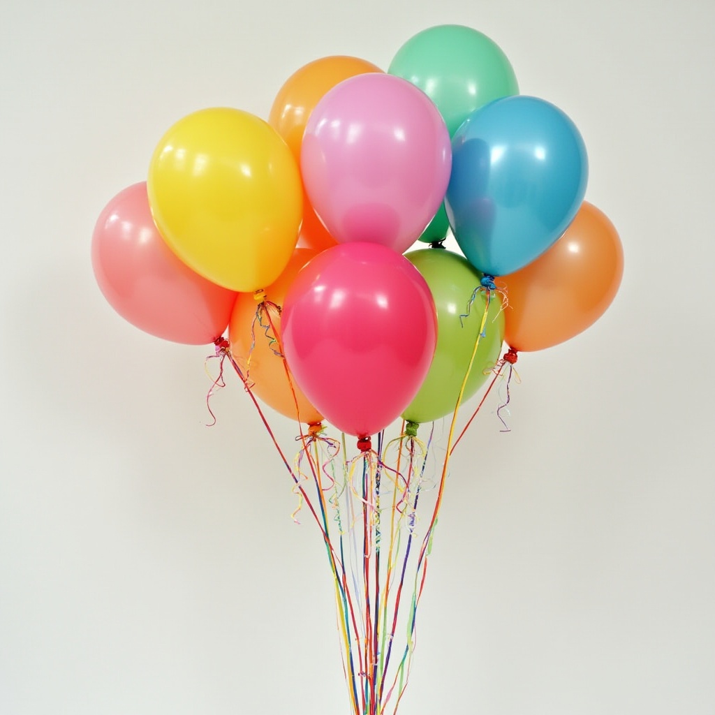 A vibrant cluster of ten balloons in various colors creates a festive atmosphere, perfect for parties or celebrations.