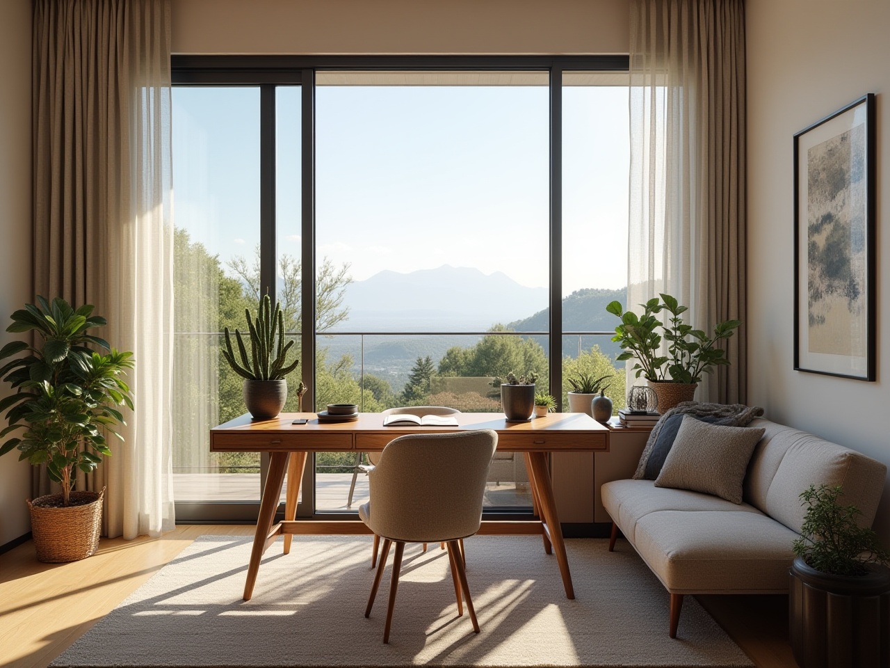 aesthetic, balance, bright, comfort, curtains, daylight, decor, furniture, greenery, home office, interior design, modern, mountain view, nature, plants, relaxation, spacious, tranquility, wooden desk, workspace