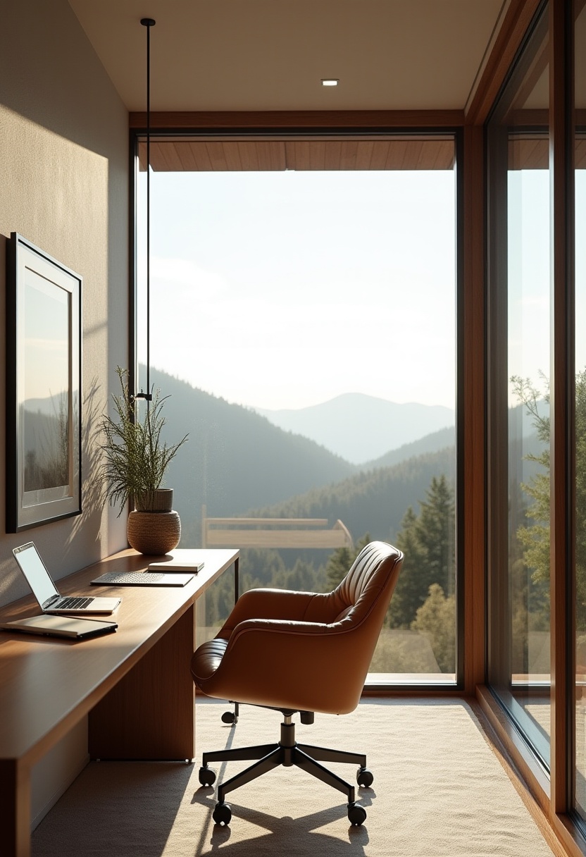 A sleek workspace features a chair and desk facing large windows, showcasing a breathtaking mountain landscape as sunlight pours in.