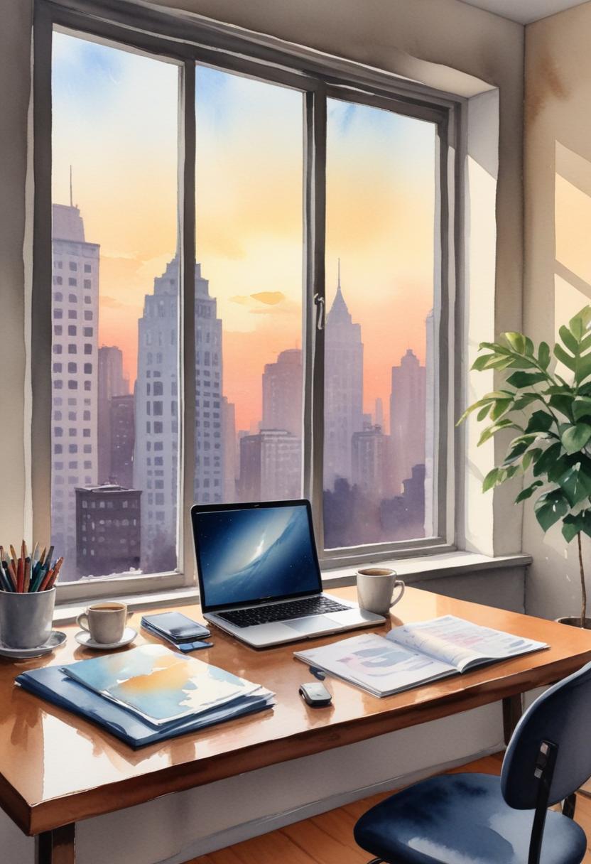 buildings, cityscape, colorful, creativity, design, desk, evening, interior, laptop, light, modern, office, plants, productive, skyline, stationery, sunset, urban, view, workspace