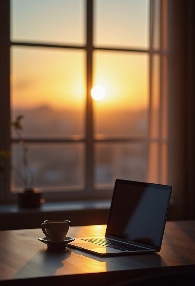 A cozy workstation with a laptop and a cup of coffee sits near a window, showcasing a beautiful sunset. Warm colors fill the atmosphere.