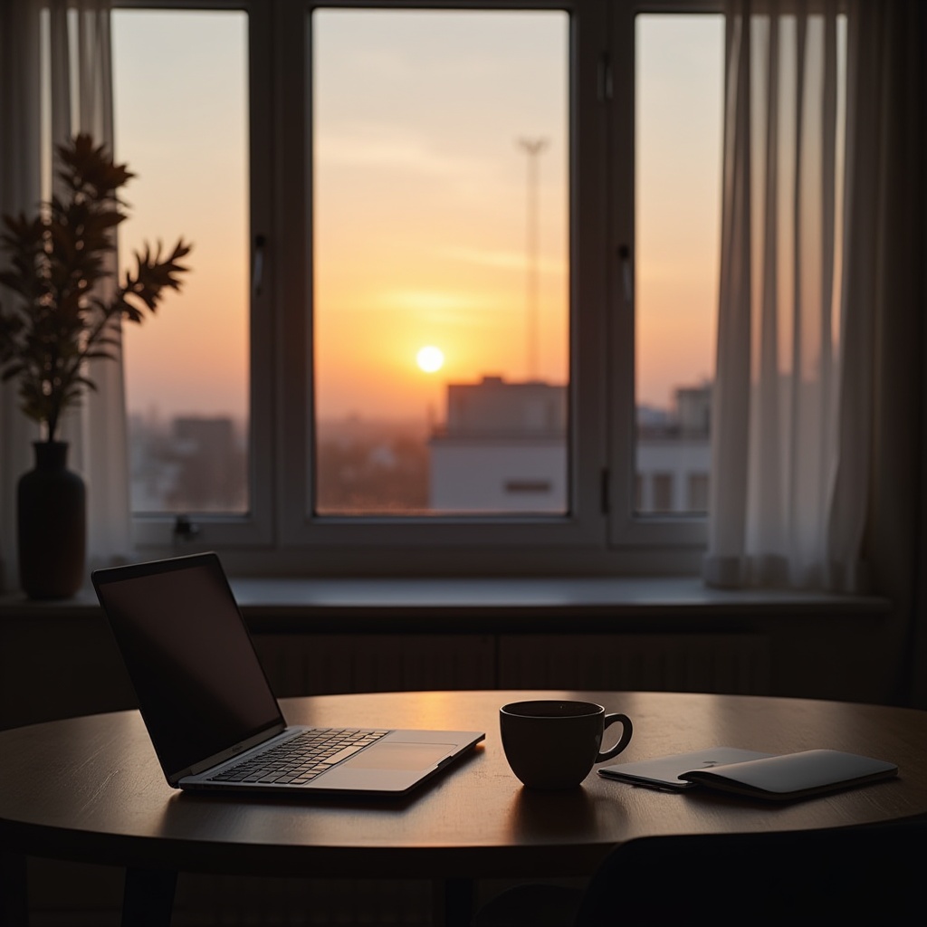 A warm sunset casts golden light through a window, illuminating a laptop and coffee cup on a wooden table, creating a cozy workspace vibe.