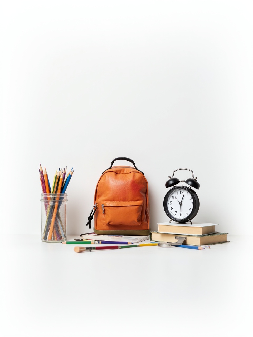 An orange backpack sits beside a clock and stacked books, with colorful pencils and paintbrushes creating a study setup.