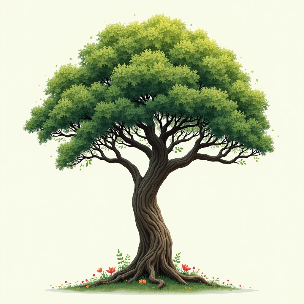 A tall tree stands proudly with lush green foliage, surrounded by colorful flowers on a tranquil, sunny day.