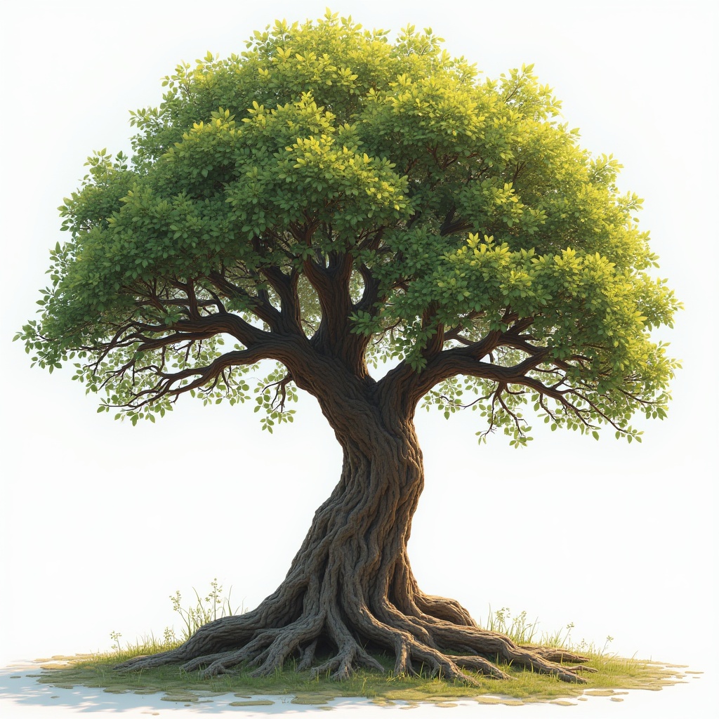 A robust tree showcases thick branches and lush leaves, casting a gentle shade on the ground in a peaceful environment.