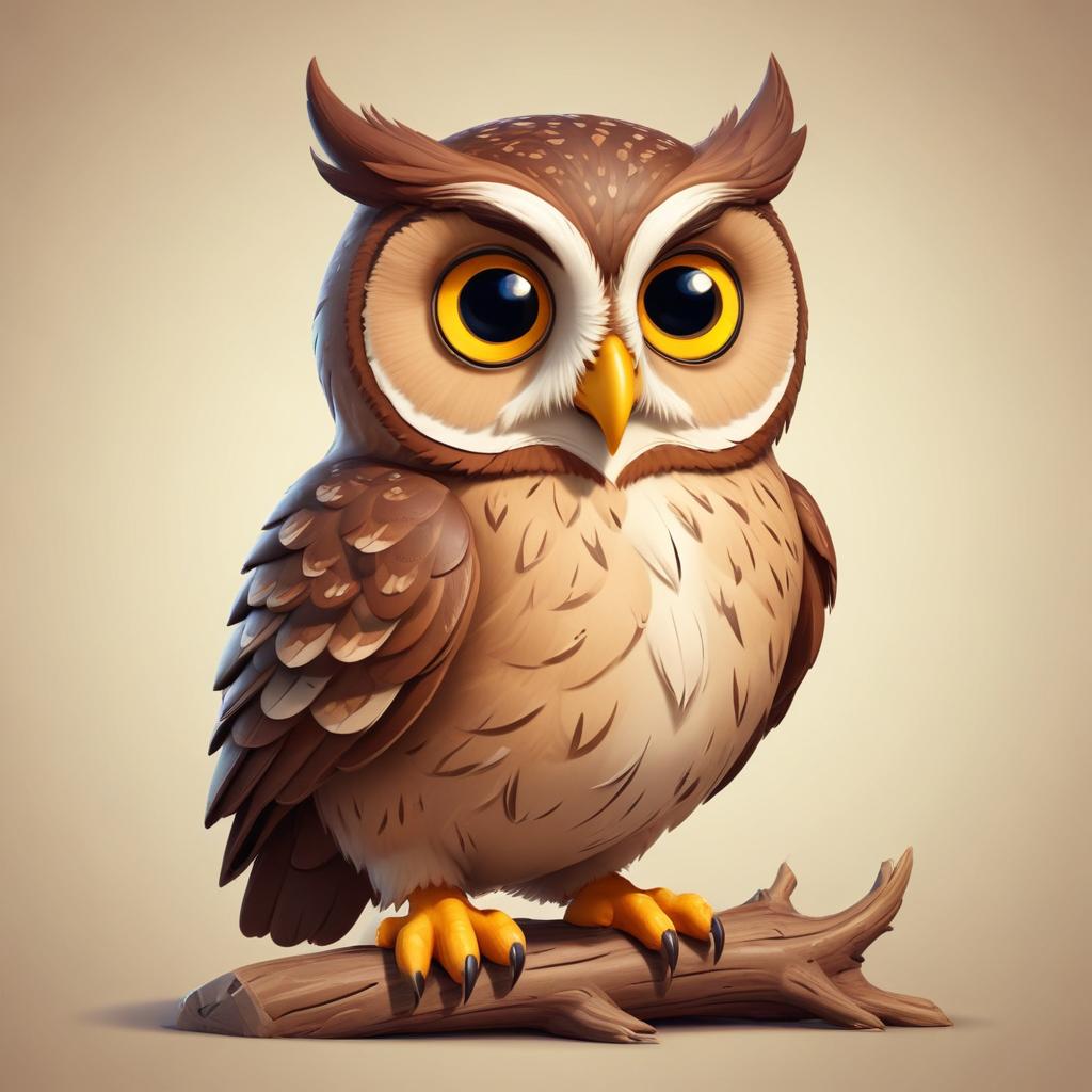 A charming cartoon owl with large eyes stands on a branch, showcasing detailed feathers and a playful expression in a light background.