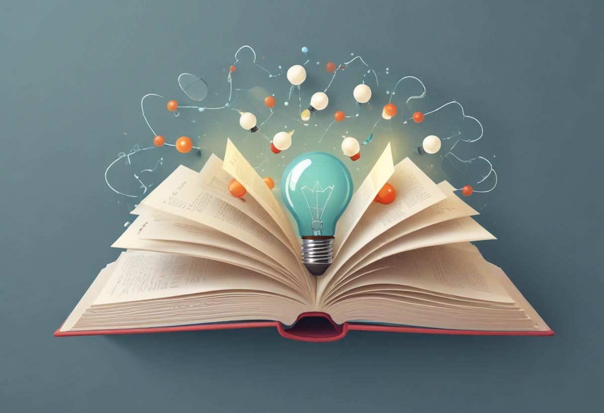 An open book displays a glowing light bulb emerging from its pages, surrounded by colorful molecular structures, symbolizing creativity and knowledge.