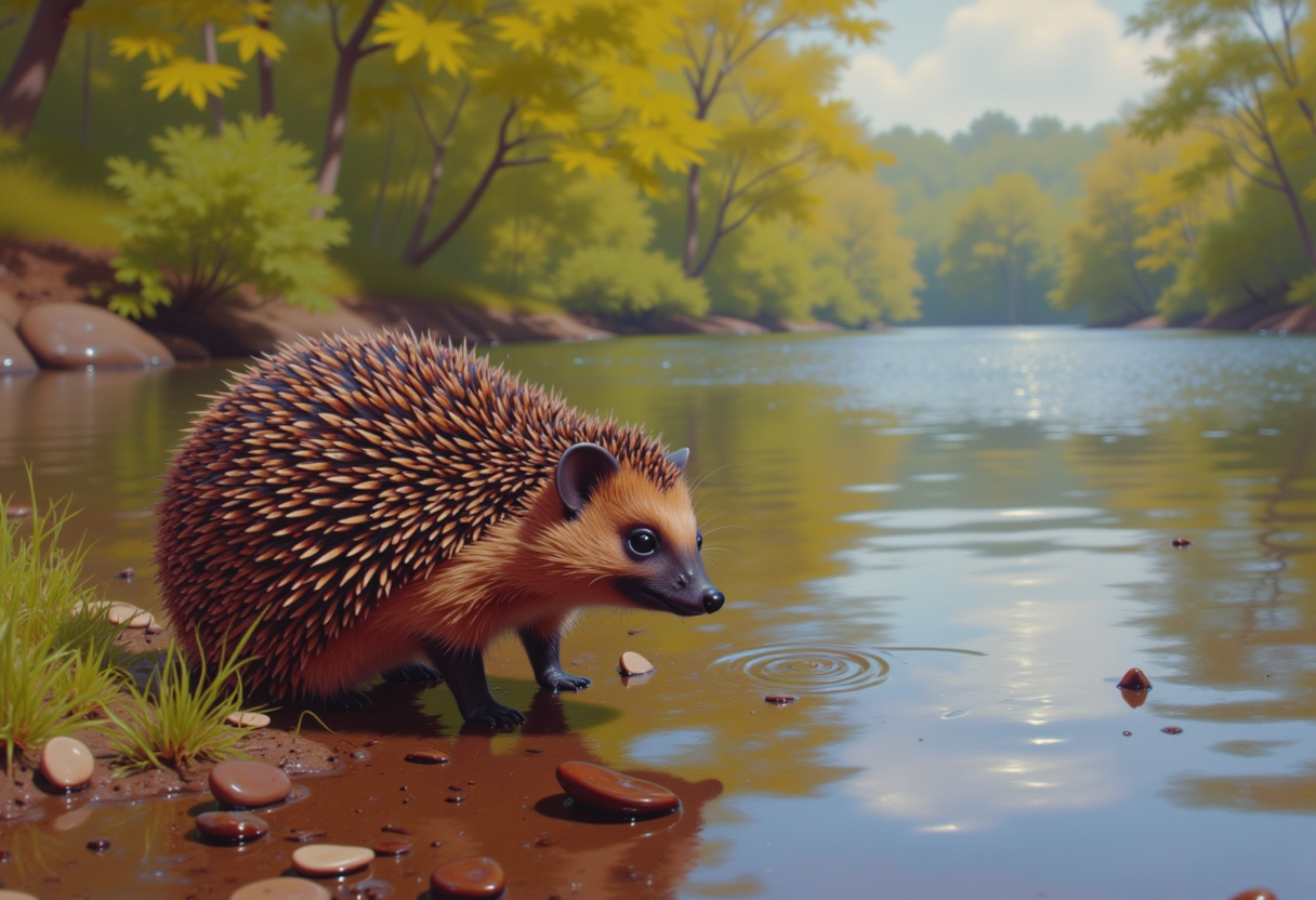 A hedgehog approaches the calm riverbank on a sunny afternoon surrounded by vibrant trees and gentle ripples in the water.