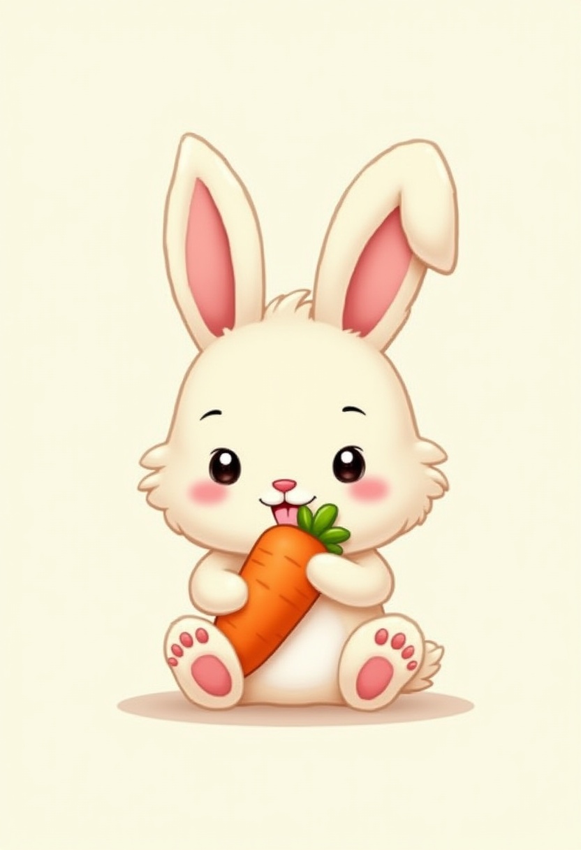 adorable, animal, bunny, carrot, cartoon, character, cheerful, colorful, cute, eating, fluffy, happy, illustration, joy, kawaii, nature, pet, playful, sitting, small