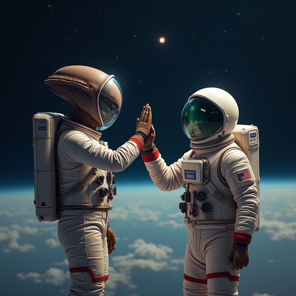 Two astronauts, one human and one alien, share a moment of connection in the vastness of space above Earth, highlighting unity and exploration.