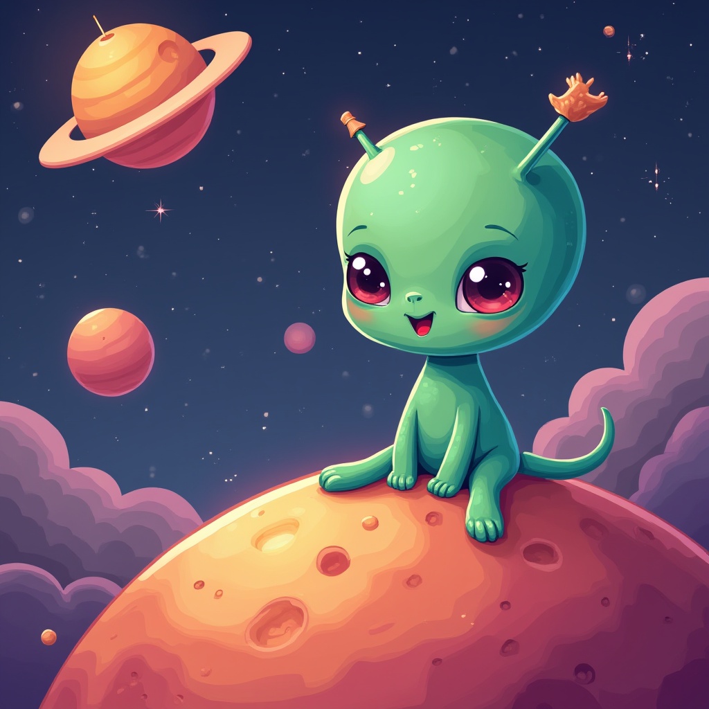 A cheerful green alien with big eyes and a crown sits on a red planet, surrounded by colorful planets and twinkling stars in a night sky.