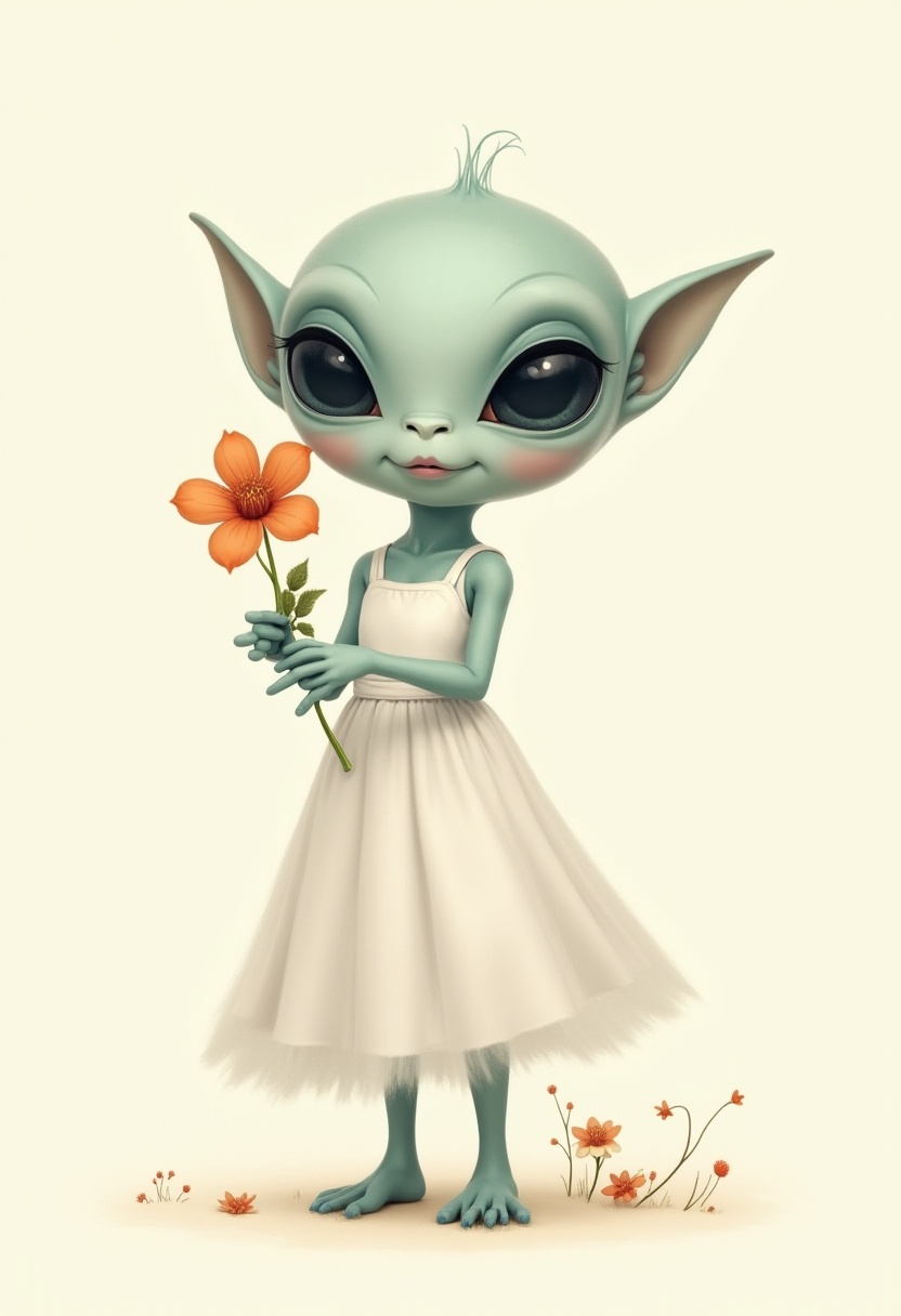 A whimsical alien girl stands holding a flower, dressed in a simple white dress. Her large eyes and playful expression create a charming vibe.
