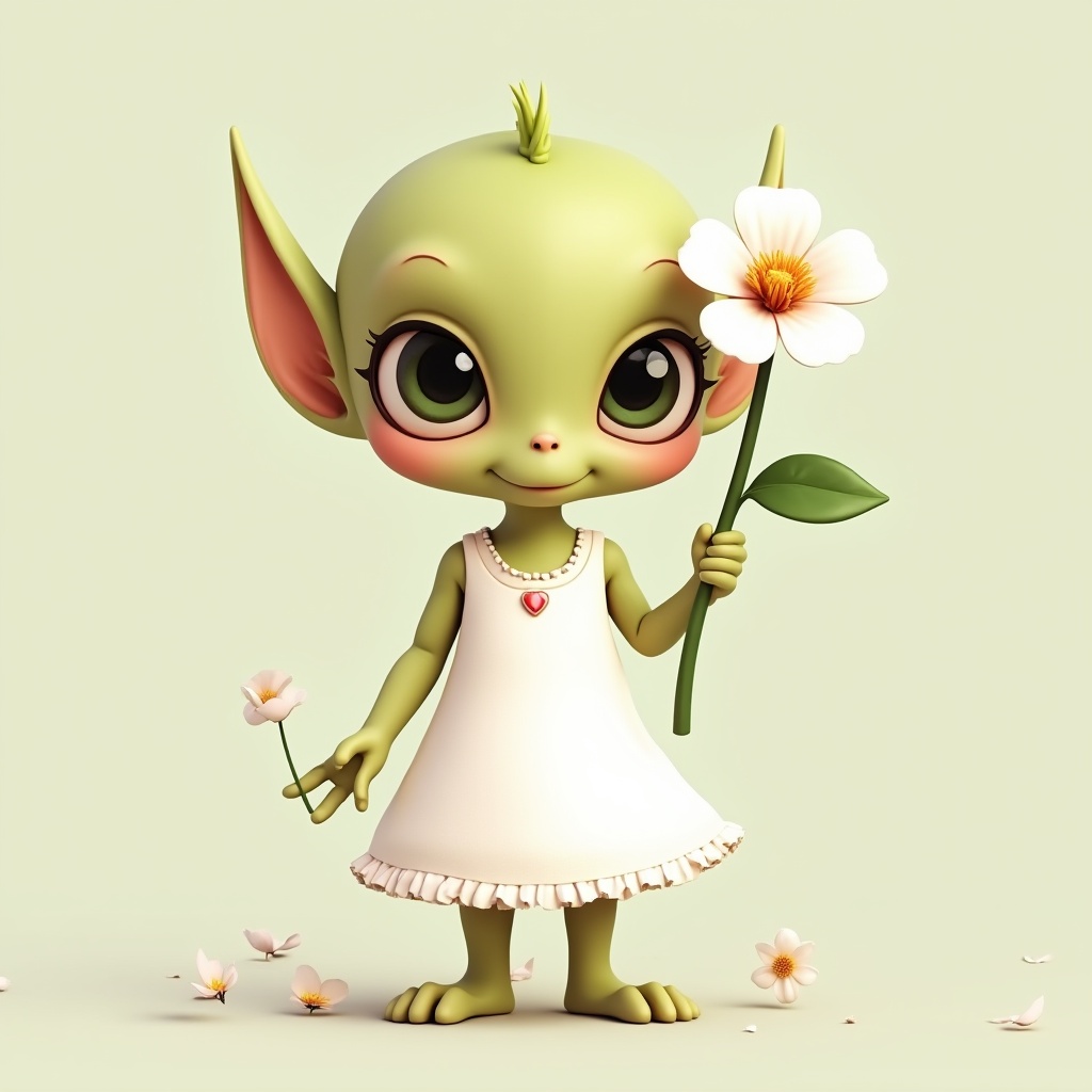 A whimsical green creature holds a flower, dressed in a simple white dress, amidst scattered petals on a soft background.