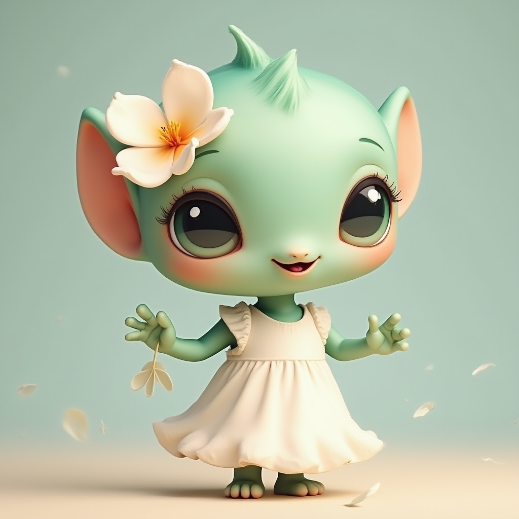 A cute character with green skin and large eyes wears a white dress and holds a flower, surrounded by floating petals in a bright setting.