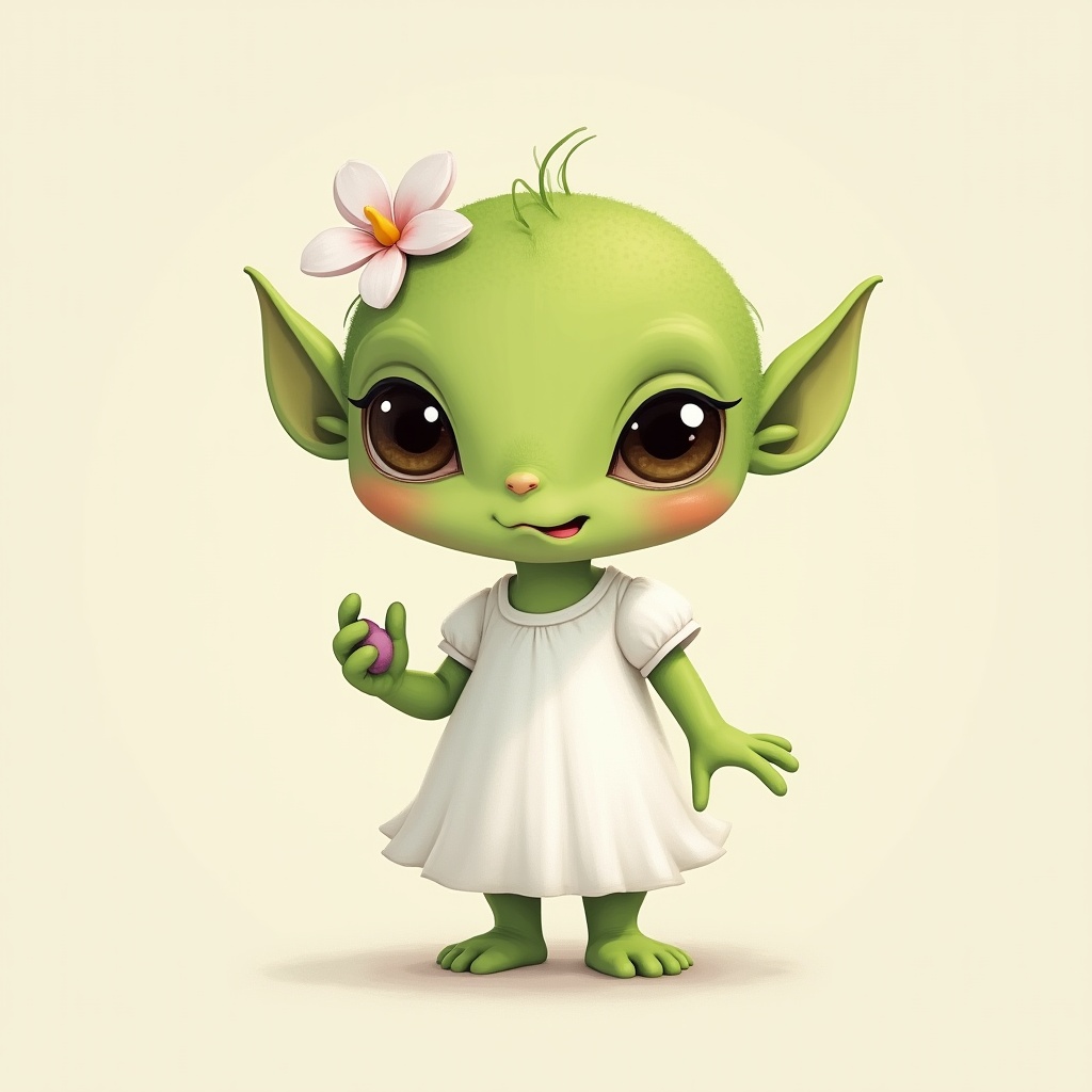 adorable, cartoon style, character concept, character design, cheerful, childlike, cute character, fantasy, fantasy art, flower, green creature, holding treat, joyful, magical, playful, small being, smiling, unique design, whimsical, white dress
