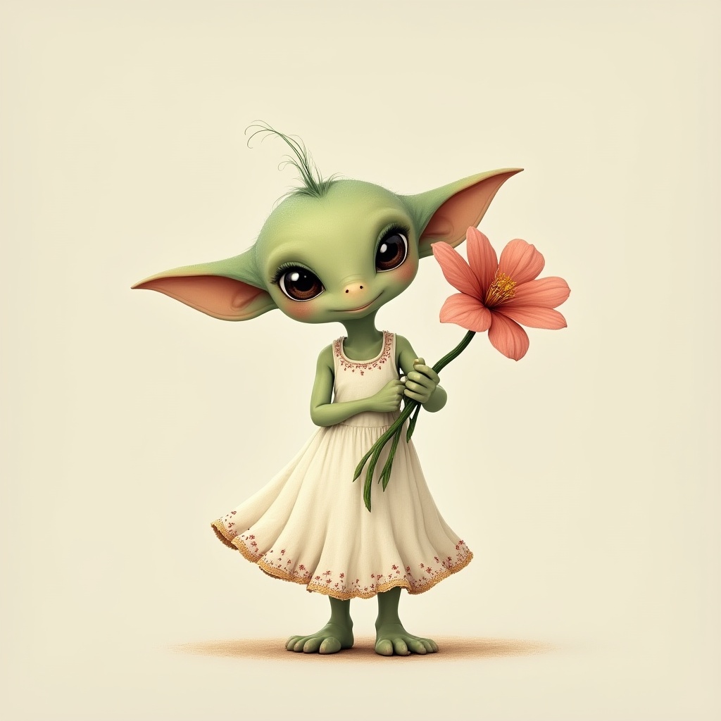 A small green creature with large ears and big eyes stands gracefully, holding a pink flower in a white dress. The setting conveys a whimsical charm.