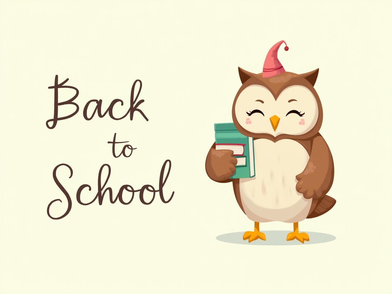 A friendly cartoon owl wearing a party hat holds books, promoting excitement for the start of the school year and learning adventures.