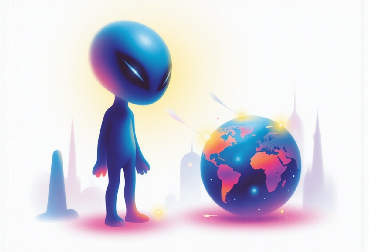 An alien figure observes Earth surrounded by cosmic elements at dawn, showcasing a colorful atmosphere filled with intrigue and wonder.