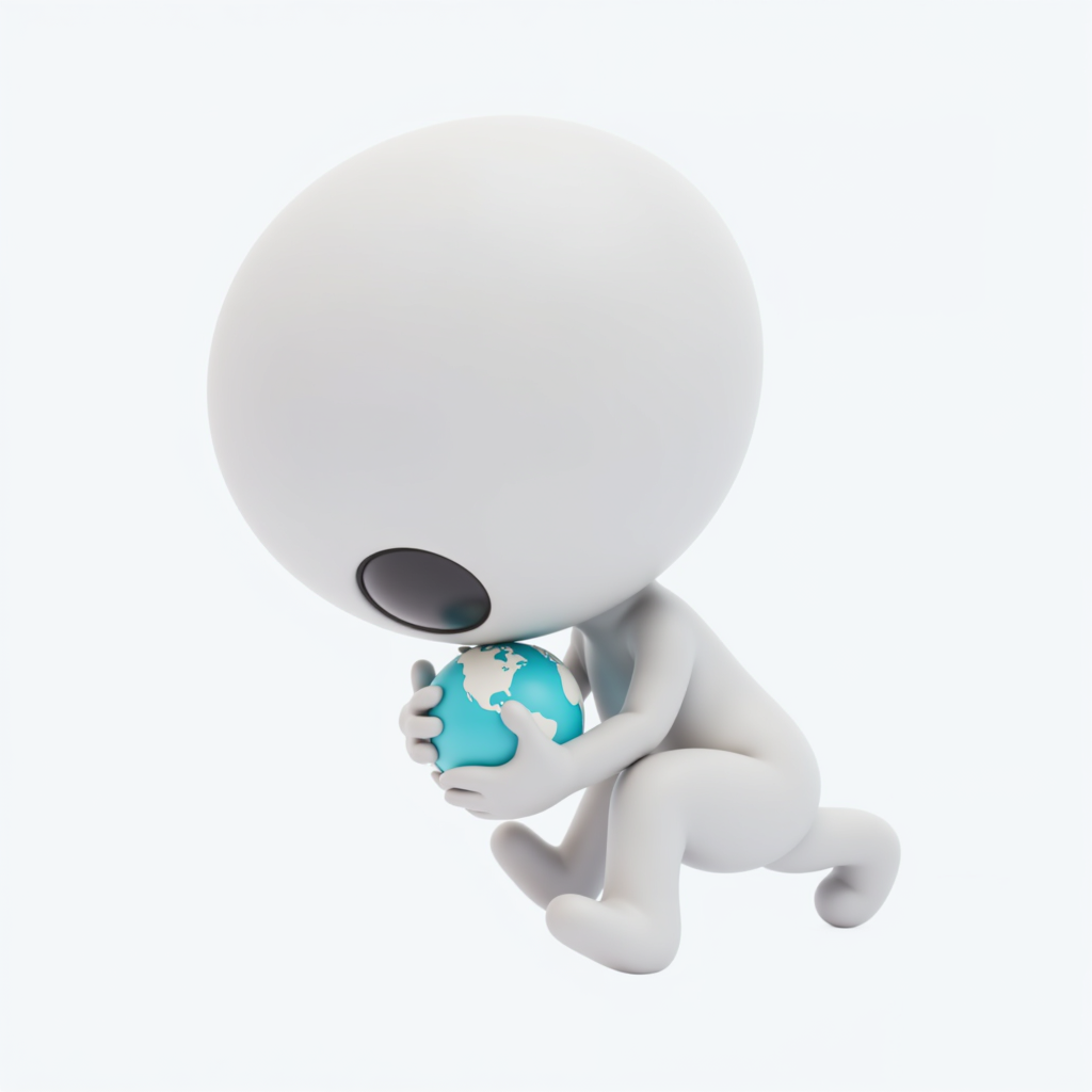 A minimalist character kneels while holding a globe, symbolizing care for the Earth and its environment in a gentle manner.