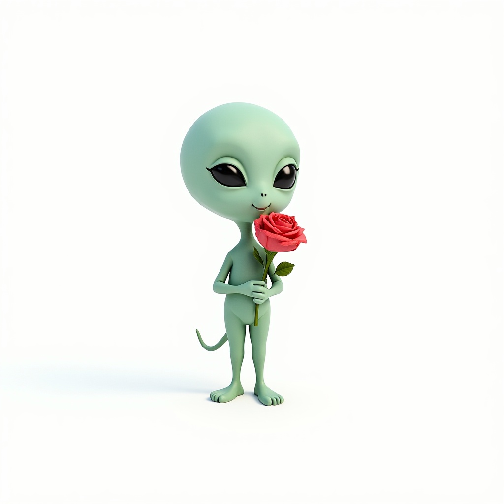 A small green alien character stands alone, gently cradling a red rose in a bright, simple environment, conveying a sense of wonder.