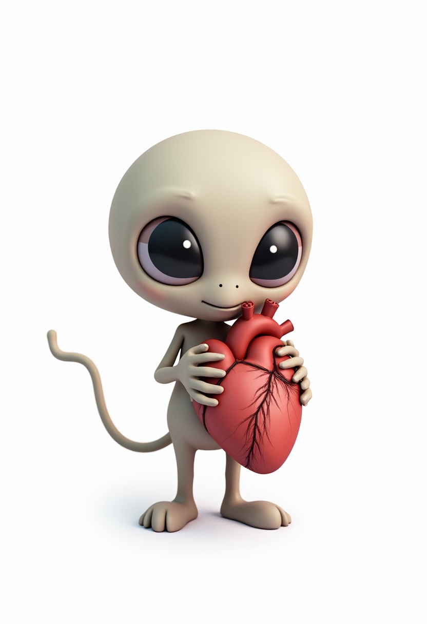 A friendly alien character with large eyes holds a red heart, showcasing a whimsical and imaginative scenario.