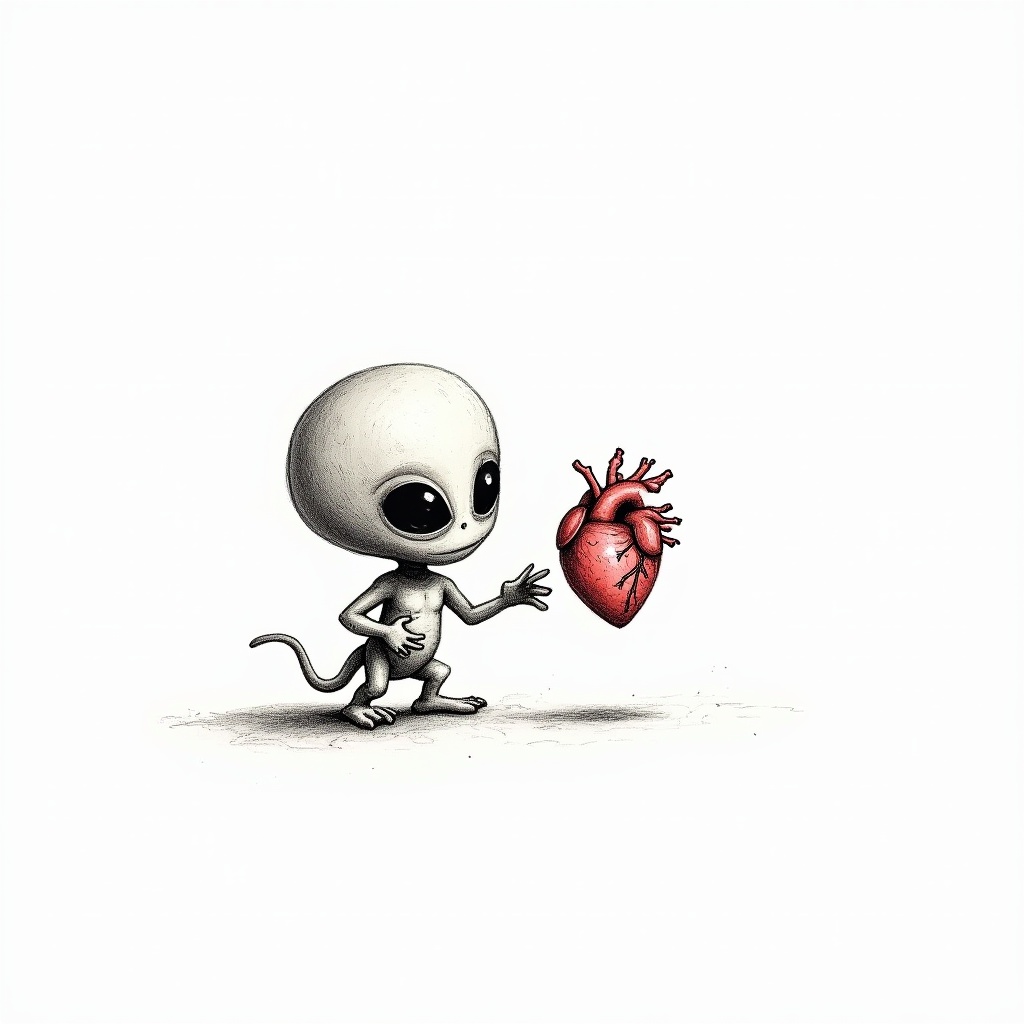 alien, art, cartoon, character, creativity, curiosity, cute, design, extraterrestrial, fantasy, heart, illustration, imaginative, innocence, love, minimalist, playful, surreal, unique, whimsical