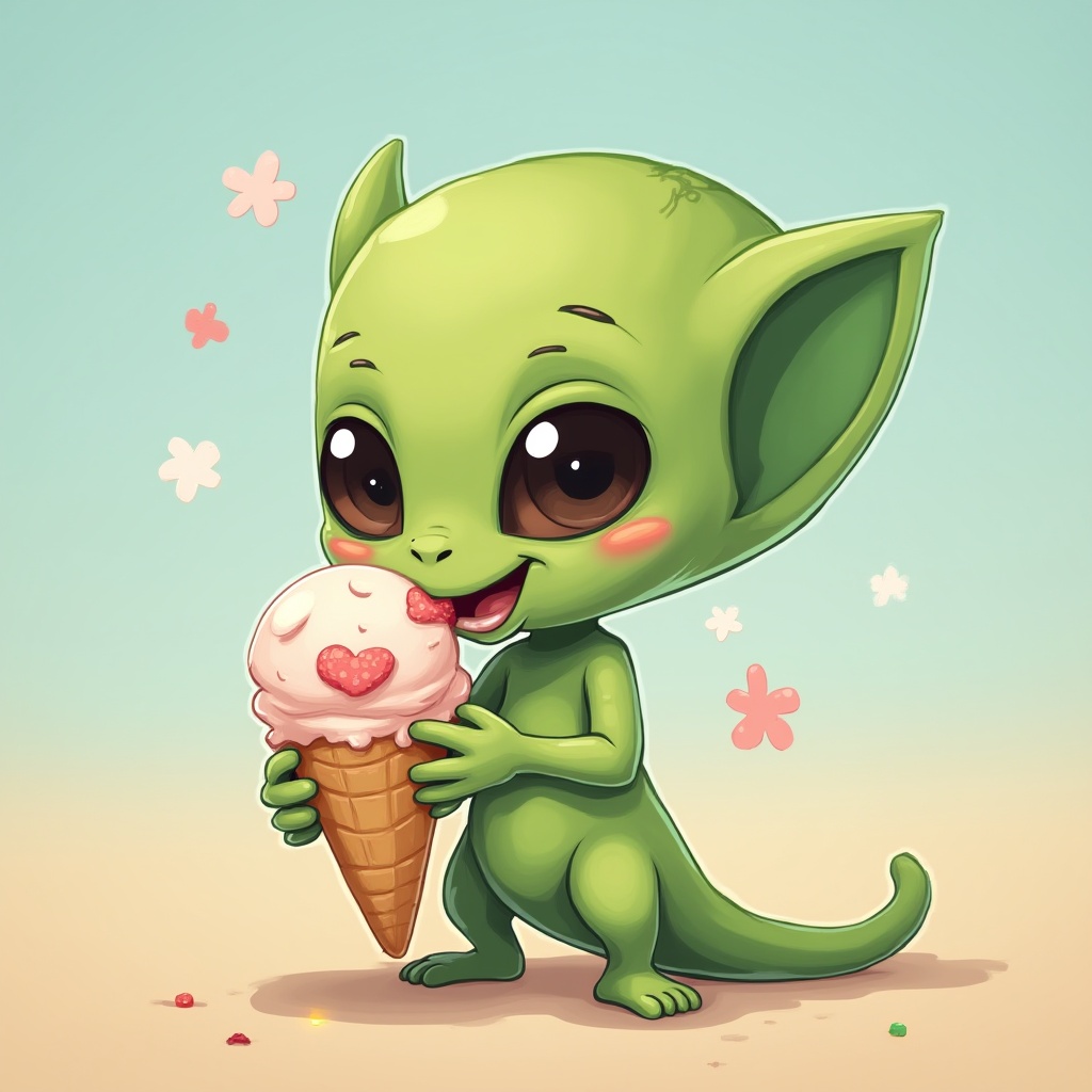 A small green creature with big eyes joyfully holds a pink heart-topped ice cream cone against a pastel backdrop.