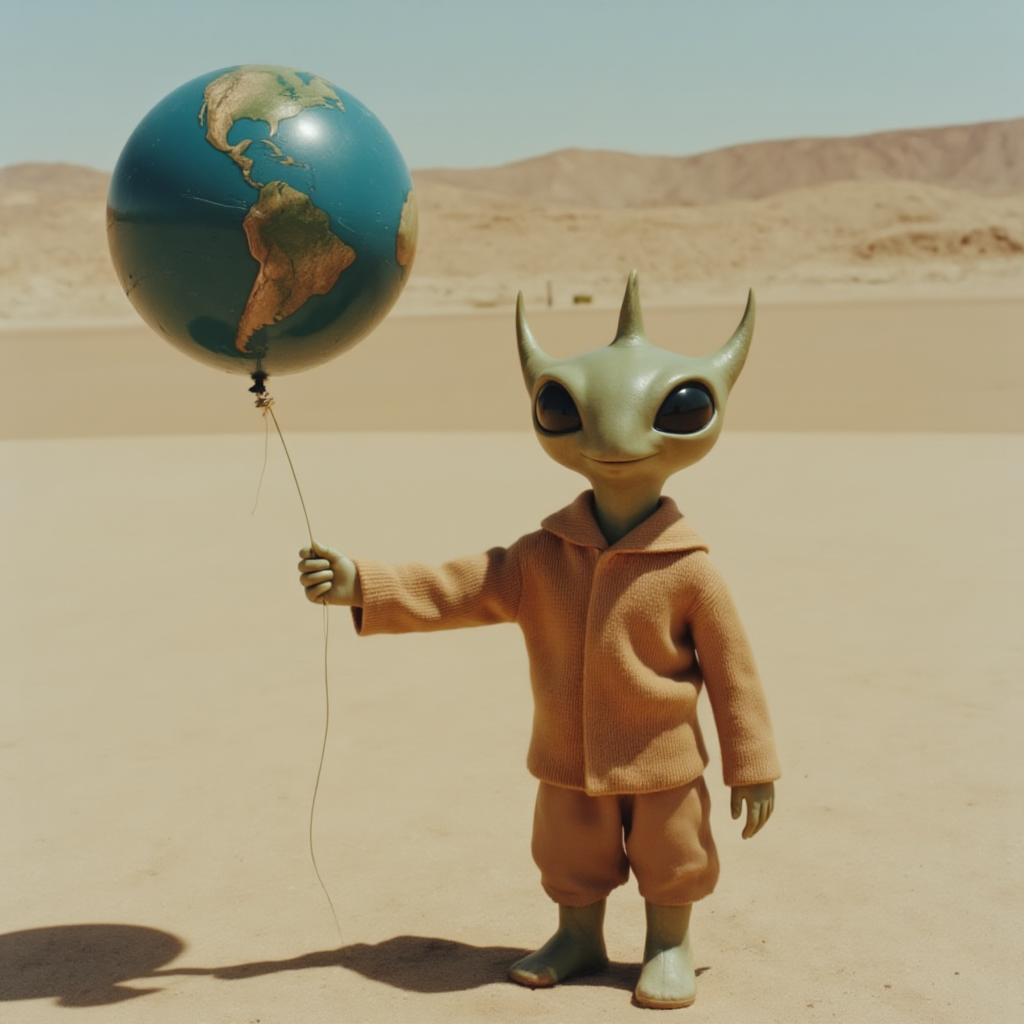 alien, balloon, child, cute, desert, dry, earth, environment, extraterrestrial, fantasy, globe, humanoid, imagination, landscape, minimal, nature, outdoor, planet, sunny, whimsical