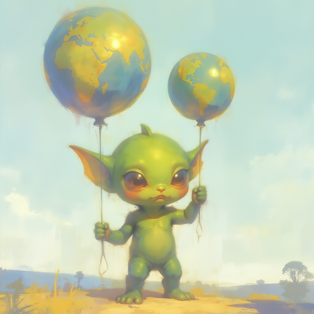 balloons, character design, childlike, cute creature, earth, environmental themes, fantasy, fun, globes, green character, illustration, imaginative, joyful, landscapes, nature, outdoor setting, playful, small creature, sunny landscape, whimsical