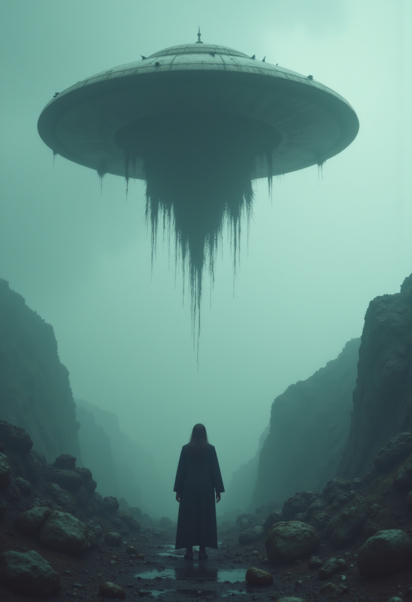 adventure, alien, cinematic, cloaked figure, dark, extraterrestrial, extraterrestrial craft, fog, hovering, intrigue, isolation, landscape, mist, mystery, rocky valley, science fiction, shadows, surreal, suspense, ufo