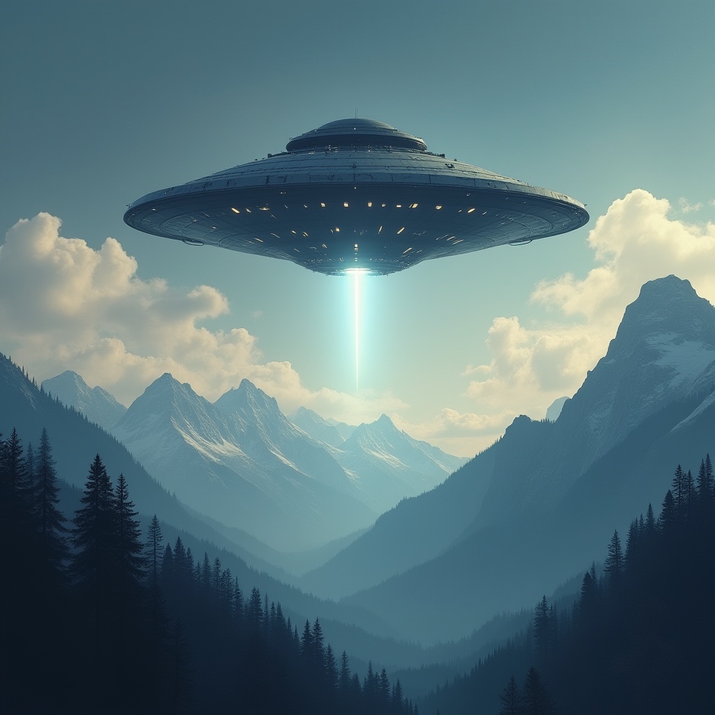 A large UFO emits a glowing beam of light while hovering above a stunning mountain range at dusk, surrounded by pine trees.