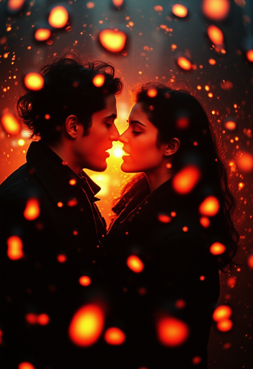 Couple embraces amidst glowing embers at twilight