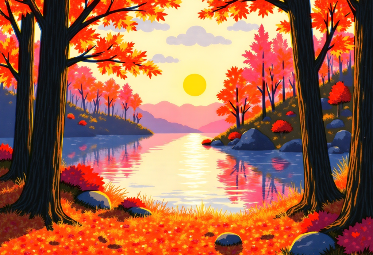 bushes, colorful, digital art, fall, foliage, forest, framed view, golden sun, illustration, lake, landscape, leaves, mountains, nature, orange trees, purple mountains, red leaves, reflection, rocks, scenery, serene, sun, sunset, trees, vibrant, water, woodland, autumn