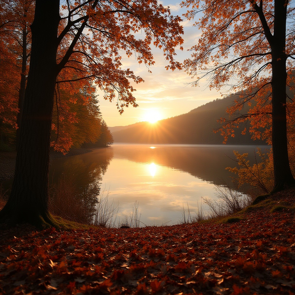 Tranquil lake reflecting a golden sunset, framed by vibrant autumn foliage, capturing the peacefulness of nature in the evening.