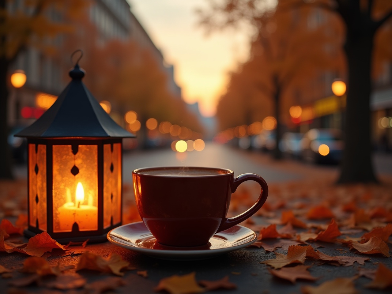 A cozy cup of coffee sits next to a glowing lantern on a quiet street covered in autumn leaves during sunset.