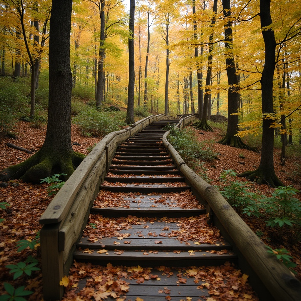 Winding wooden stairs lead through a tranquil forest filled with bright yellow and orange leaves during autumn, inviting a peaceful stroll.