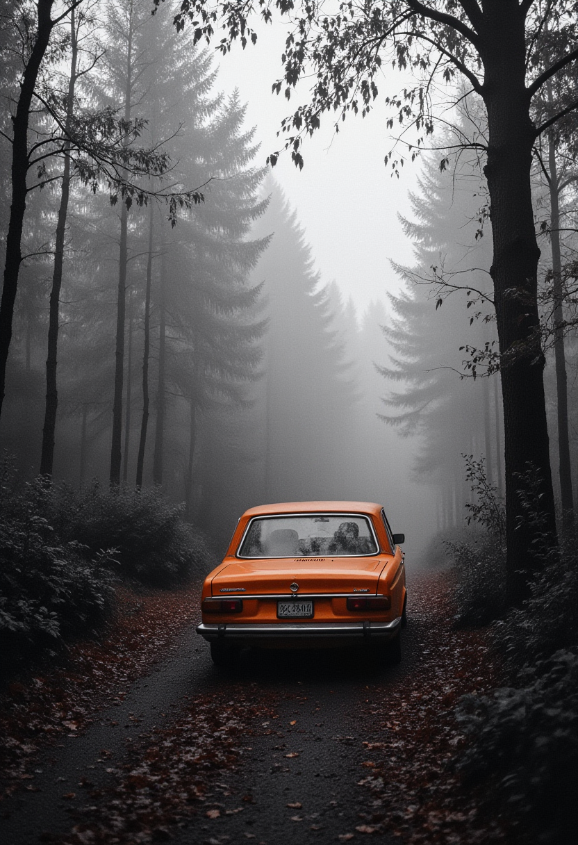 An orange car navigates a narrow, fog-covered path in a dense forest, surrounded by towering trees and autumn leaves.